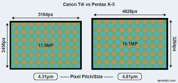 Despite having a smaller sensor, the Canon T4i offers a higher resolution of 17.9 megapixels, compared with 16.1 MP of the Pentax K-5. This megapixels advantage comes at the cost of a higher pixel density and a smaller size of the individual pixel (with a pixel pitch of 4.31μm versus 4.81μm for the K-5). However, it should be noted that the T4i is a somewhat more recent model (by 1 year and 8 months) than the K-5, and its sensor might have benefitted from technological advances during this time that partly offset its pixel-size disadvantage.