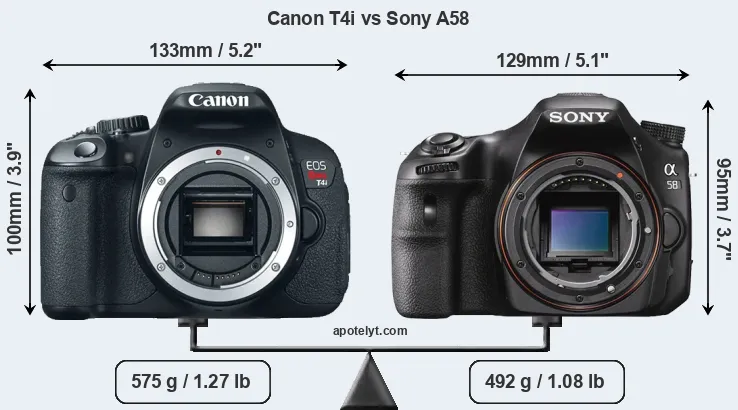An illustration of the physical size and weight of the Canon T4i and the Sony A58 is provided in the side-by-side display below. The two cameras are presented according to their relative size. Three successive views from the front, the top, and the rear are shown. All width, height and depth dimensions are rounded to the nearest millimeter.