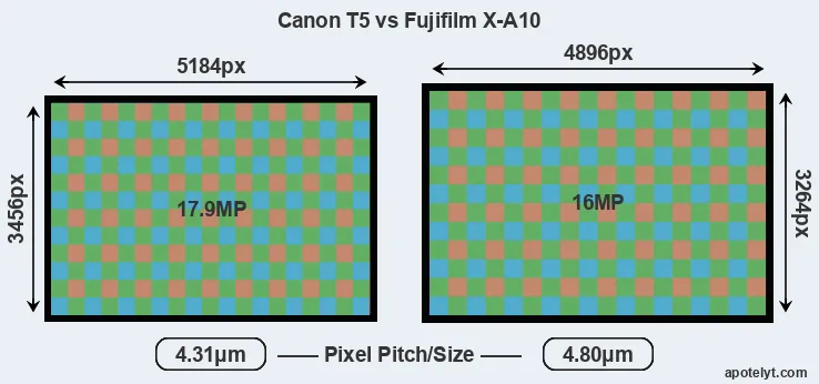 Despite having a smaller sensor, the Canon T5 offers a higher resolution of 17.9 megapixels, compared with 16 MP of the Fujifilm X-A10. This megapixels advantage comes at the cost of a higher pixel density and a smaller size of the individual pixel (with a pixel pitch of 4.31μm versus 4.80μm for the X-A10). Moreover, it should be noted that the X-A10 is much more recent (by 2 years and 9 months) than the T5, and its sensor will have benefitted from technological advances during this time that further enhance the light gathering capacity of its pixel-units.