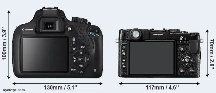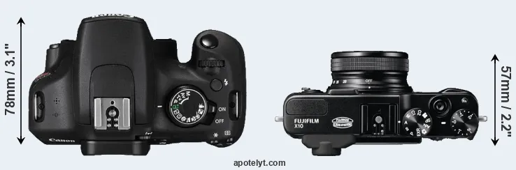 The physical size and weight of the Canon T5 and the Fujifilm X10 are illustrated in the side-by-side display below. The two cameras are presented according to their relative size. Three consecutive perspectives from the front, the top, and the back are available. All width, height and depth measures are rounded to the nearest millimeter.