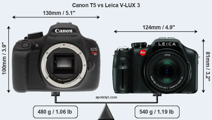 An illustration of the physical size and weight of the Canon T5 and the Leica V-LUX 3 is provided in the side-by-side display below. The two cameras are presented according to their relative size. Three successive views from the front, the top, and the rear are shown. All size dimensions are rounded to the nearest millimeter.