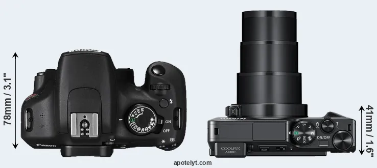 The above size and weight comparisons are to some extent incomplete and possibly misleading, as the A1000 has a lens built in, whereas the T5 is an interchangeable lens camera that requires a separate lens. Attaching the latter will add extra weight and bulk to the setup. You can compare the optics available for the T5 and their specifications in the Canon EF Lens Catalog.