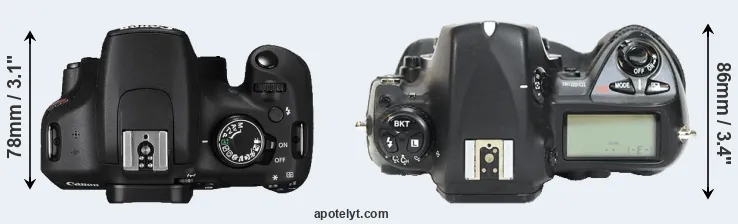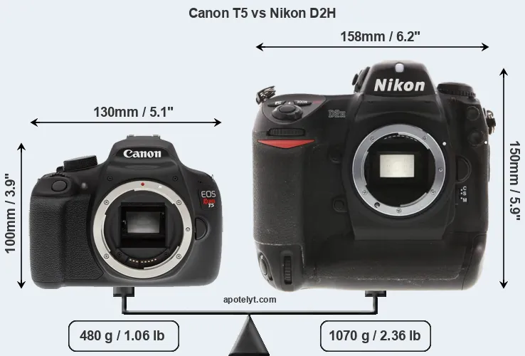 The side-by-side display below illustrates the physical size and weight of the Canon T5 and the Nikon D2H. The two cameras are presented according to their relative size. Three consecutive views from the front, the top, and the rear side are shown. All width, height and depth measures are rounded to the nearest millimeter.