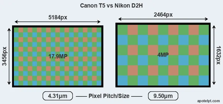 Despite having a smaller sensor, the Canon T5 offers a higher resolution of 17.9 megapixels, compared with 4 MP of the Nikon D2H. This megapixels advantage comes at the cost of a higher pixel density and a smaller size of the individual pixel (with a pixel pitch of 4.31μm versus 9.50μm for the D2H). However, it should be noted that the T5 is much more recent (by 10 years and 6 months) than the D2H, and its sensor will have benefitted from technological advances during this time that make it possible to gather light more efficiently.