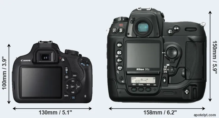 The physical size and weight of the Canon T5 and the Nikon D2X are illustrated in the side-by-side display below. The two cameras are presented according to their relative size. Three consecutive views from the front, the top, and the rear side are shown. All size dimensions are rounded to the nearest millimeter.