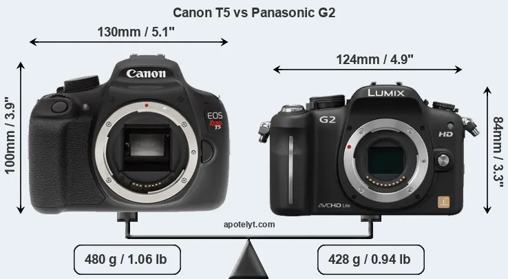 An illustration of the physical size and weight of the Canon T5 and the Panasonic G2 is provided in the side-by-side display below. The two cameras are presented according to their relative size. Three consecutive views from the front, the top, and the rear side are shown. All width, height and depth dimensions are rounded to the nearest millimeter.