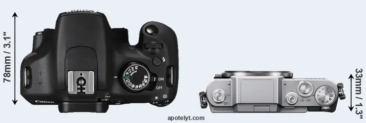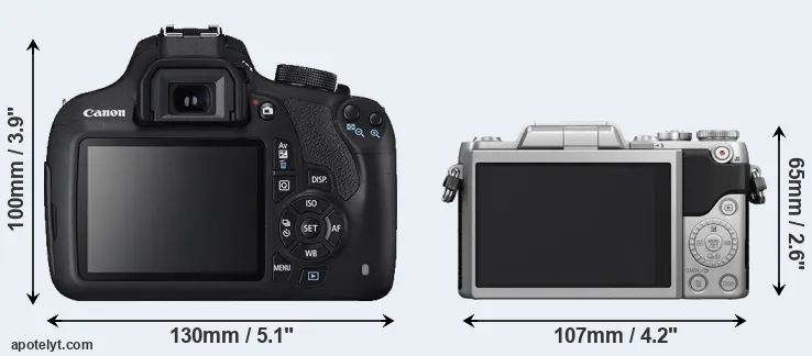 The side-by-side display below illustrates the physical size and weight of the Canon T5 and the Panasonic GF7. The two cameras are presented according to their relative size. Three consecutive views from the front, the top, and the rear side are shown. All width, height and depth dimensions are rounded to the nearest millimeter.