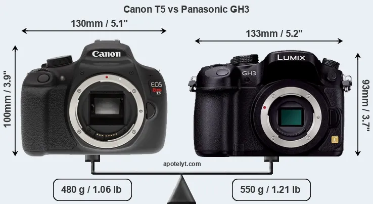 An illustration of the physical size and weight of the Canon T5 and the Panasonic GH3 is provided in the side-by-side display below. The two cameras are presented according to their relative size. Three successive views from the front, the top, and the rear are shown. All width, height and depth dimensions are rounded to the nearest millimeter.