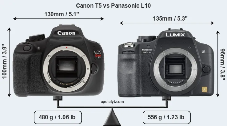 An illustration of the physical size and weight of the Canon T5 and the Panasonic L10 is provided in the side-by-side display below. The two cameras are presented according to their relative size. Three successive views from the front, the top, and the rear are shown. All size dimensions are rounded to the nearest millimeter.