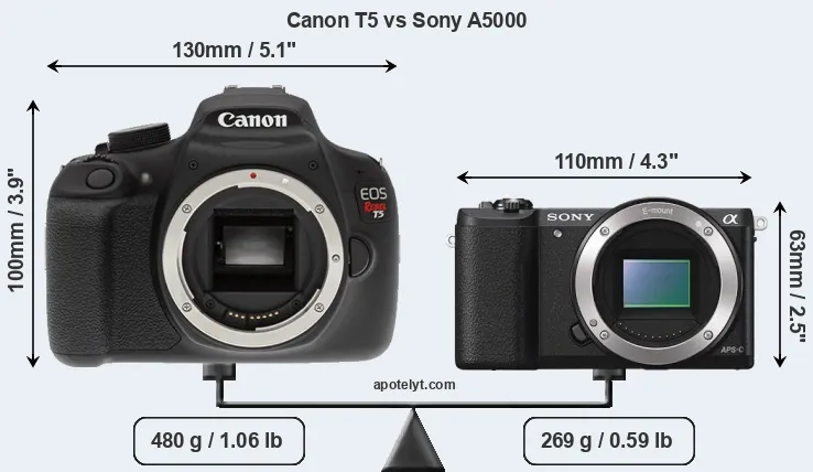 The side-by-side display below illustrates the physical size and weight of the Canon T5 and the Sony A5000. The two cameras are presented according to their relative size. Three consecutive views from the front, the top, and the rear side are shown. All width, height and depth measures are rounded to the nearest millimeter.