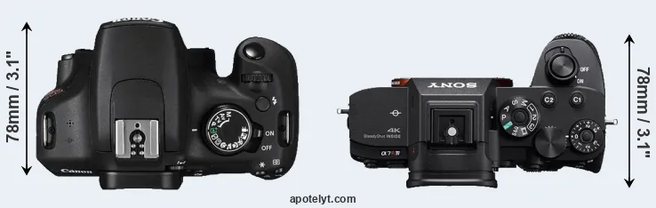 An illustration of the physical size and weight of the Canon T5 and the Sony A7R IV is provided in the side-by-side display below. The two cameras are presented according to their relative size. Three consecutive views from the front, the top, and the rear side are shown. All width, height and depth dimensions are rounded to the nearest millimeter.