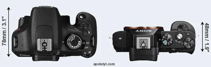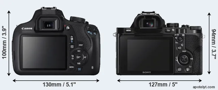The side-by-side display below illustrates the physical size and weight of the Canon T5 and the Sony A7S. The two cameras are presented according to their relative size. Three consecutive perspectives from the front, the top, and the back are available. All width, height and depth dimensions are rounded to the nearest millimeter.
