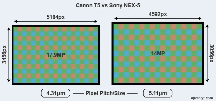 Despite having a smaller sensor, the Canon T5 offers a higher resolution of 17.9 megapixels, compared with 14 MP of the Sony NEX-5. This megapixels advantage comes at the cost of a higher pixel density and a smaller size of the individual pixel (with a pixel pitch of 4.31μm versus 5.11μm for the NEX-5). However, it should be noted that the T5 is much more recent (by 3 years and 9 months) than the NEX-5, and its sensor will have benefitted from technological advances during this time that make it possible to gather light more efficiently.