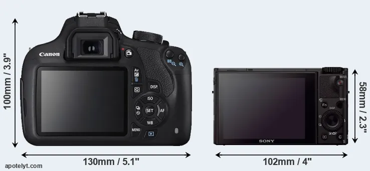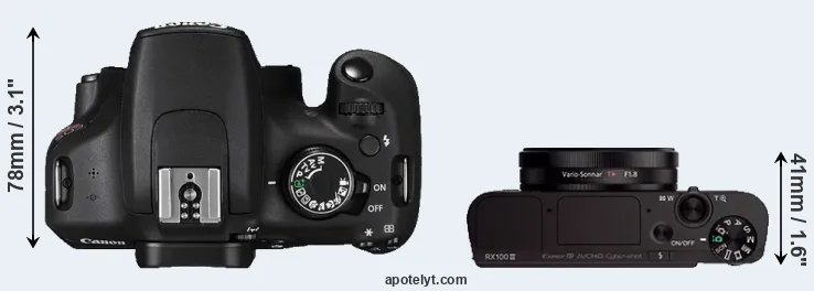 The side-by-side display below illustrates the physical size and weight of the Canon T5 and the Sony RX100 III. The two cameras are presented according to their relative size. Three consecutive views from the front, the top, and the rear side are shown. All width, height and depth dimensions are rounded to the nearest millimeter.