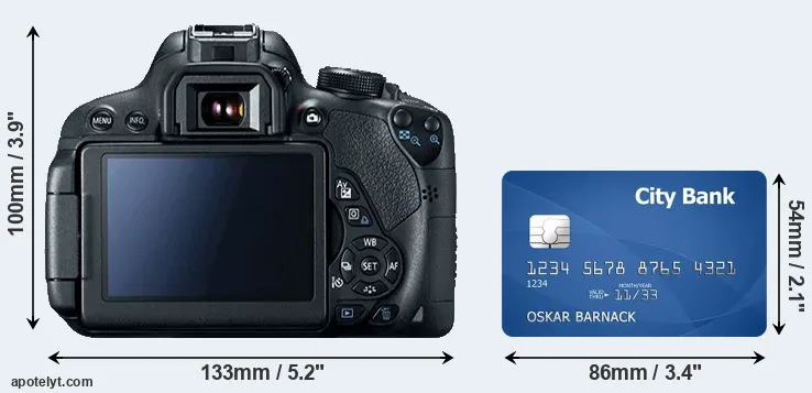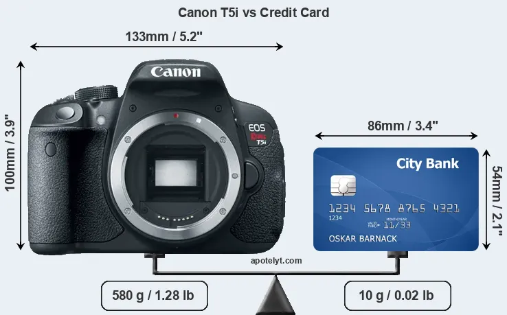 The physical dimensions of the Canon T5i relative to a credit card are illustrated in the side-by-side display below. Three consecutive views from the front, the top, and the rear side are shown. All size dimensions are rounded to the nearest millimeter.