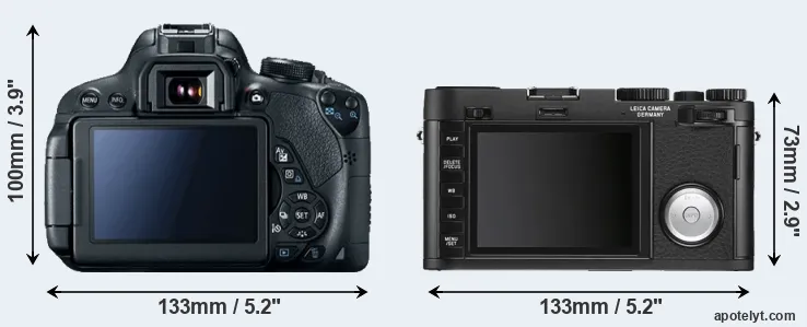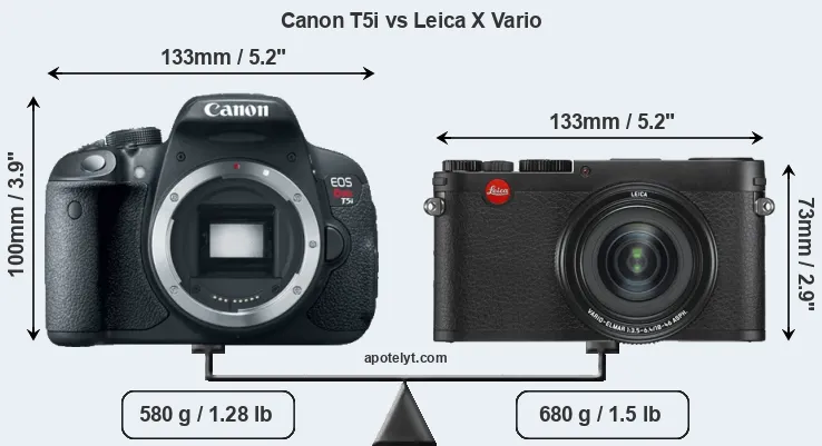 The side-by-side display below illustrates the physical size and weight of the Canon T5i and the Leica X Vario. The two cameras are presented according to their relative size. Three consecutive perspectives from the front, the top, and the back are available. All width, height and depth measures are rounded to the nearest millimeter.
