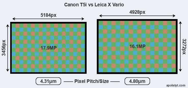 Despite having a smaller sensor, the Canon T5i offers a higher resolution of 17.9 megapixels, compared with 16.1 MP of the Leica X Vario. This megapixels advantage comes at the cost of a higher pixel density and a smaller size of the individual pixel (with a pixel pitch of 4.31μm versus 4.80μm for the X Vario). It is noteworthy in this context that the two cameras were released in close succession, so that their sensors are from the same technological generation.