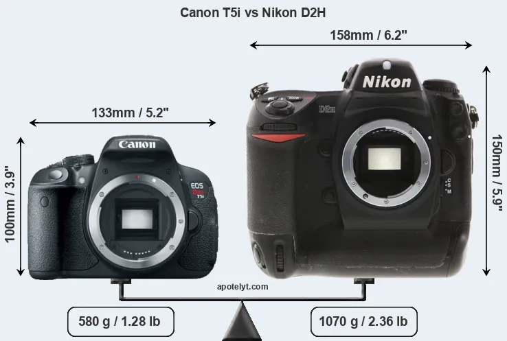 If the front view area (width x height) of the cameras is taken as an aggregate measure of their size, the Nikon D2H is considerably larger (78 percent) than the Canon T5i. Moreover, the D2H is substantially heavier (84 percent) than the T5i. It is noteworthy in this context that the D2H is splash and dust-proof, while the T5i does not feature any corresponding weather-sealing.