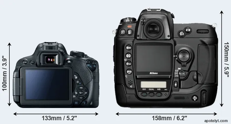 The physical size and weight of the Canon T5i and the Nikon D2H are illustrated in the side-by-side display below. The two cameras are presented according to their relative size. Three consecutive views from the front, the top, and the rear side are shown. All size dimensions are rounded to the nearest millimeter.