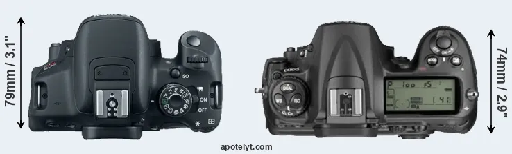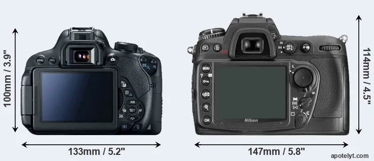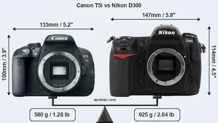 The physical size and weight of the Canon T5i and the Nikon D300 are illustrated in the side-by-side display below. The two cameras are presented according to their relative size. Three consecutive perspectives from the front, the top, and the back are available. All size dimensions are rounded to the nearest millimeter.