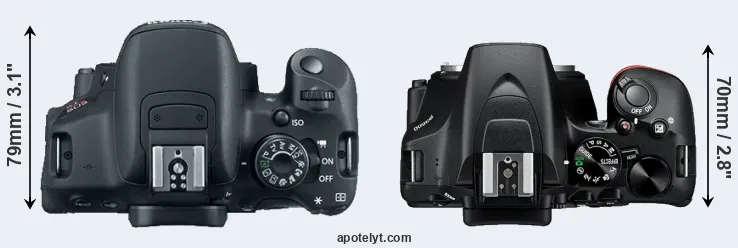 An illustration of the physical size and weight of the Canon T5i and the Nikon D3500 is provided in the side-by-side display below. The two cameras are presented according to their relative size. Three consecutive perspectives from the front, the top, and the back are available. All size dimensions are rounded to the nearest millimeter.