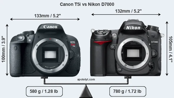 An illustration of the physical size and weight of the Canon T5i and the Nikon D7000 is provided in the side-by-side display below. The two cameras are presented according to their relative size. Three successive views from the front, the top, and the rear are shown. All width, height and depth measures are rounded to the nearest millimeter.