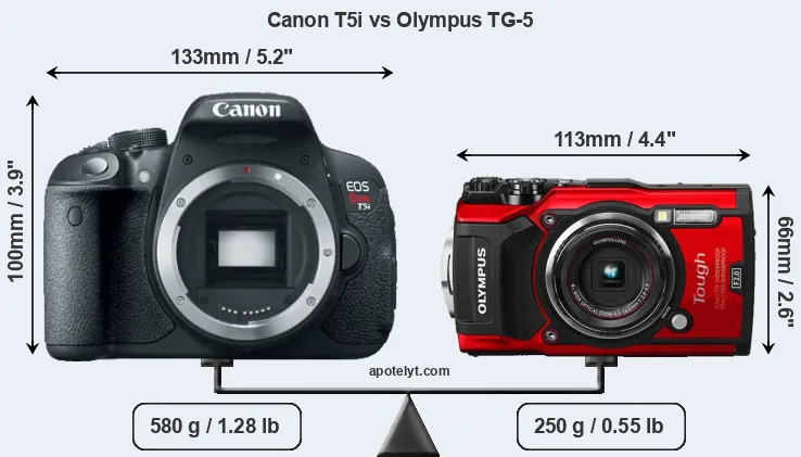 An illustration of the physical size and weight of the Canon T5i and the Olympus TG-5 is provided in the side-by-side display below. The two cameras are presented according to their relative size. Three consecutive views from the front, the top, and the rear side are shown. All width, height and depth measures are rounded to the nearest millimeter.