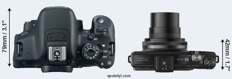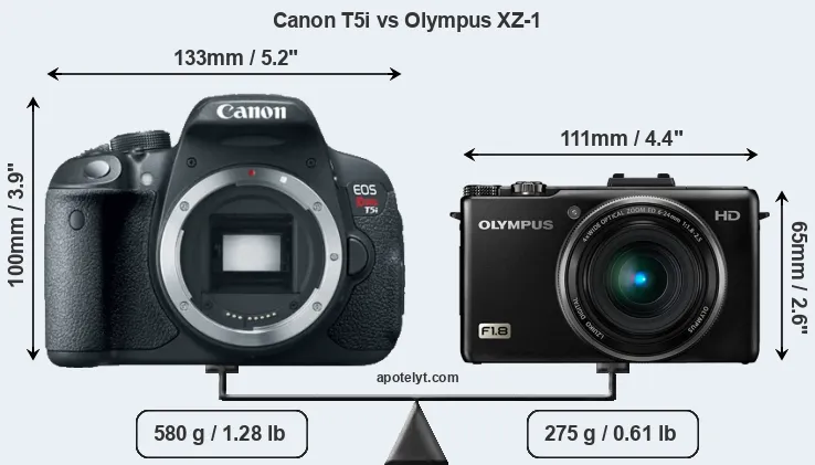 An illustration of the physical size and weight of the Canon T5i and the Olympus XZ-1 is provided in the side-by-side display below. The two cameras are presented according to their relative size. Three consecutive views from the front, the top, and the rear side are shown. All width, height and depth measures are rounded to the nearest millimeter.