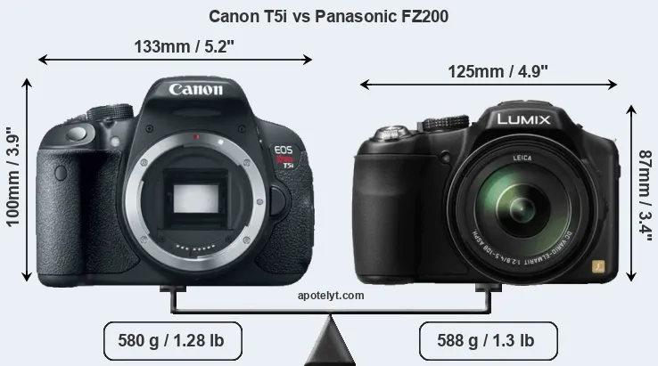 An illustration of the physical size and weight of the Canon T5i and the Panasonic FZ200 is provided in the side-by-side display below. The two cameras are presented according to their relative size. Three consecutive views from the front, the top, and the rear side are shown. All width, height and depth dimensions are rounded to the nearest millimeter.