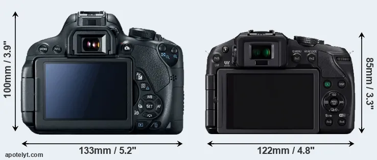 The side-by-side display below illustrates the physical size and weight of the Canon T5i and the Panasonic G6. The two cameras are presented according to their relative size. Three consecutive perspectives from the front, the top, and the back are available. All width, height and depth dimensions are rounded to the nearest millimeter.