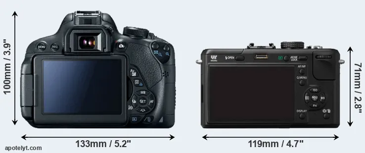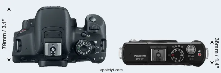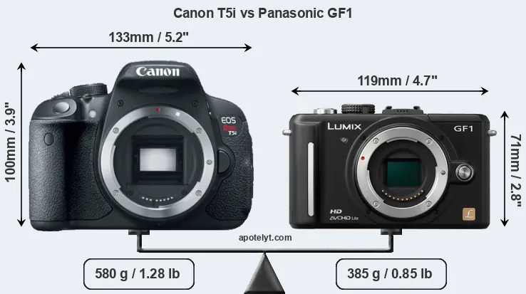 The side-by-side display below illustrates the physical size and weight of the Canon T5i and the Panasonic GF1. The two cameras are presented according to their relative size. Three consecutive perspectives from the front, the top, and the back are available. All width, height and depth measures are rounded to the nearest millimeter.