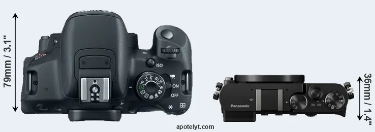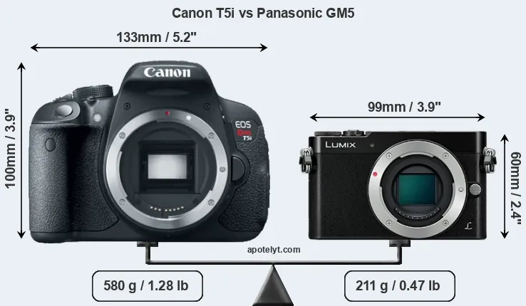 The physical size and weight of the Canon T5i and the Panasonic GM5 are illustrated in the side-by-side display below. The two cameras are presented according to their relative size. Three consecutive perspectives from the front, the top, and the back are available. All width, height and depth dimensions are rounded to the nearest millimeter.