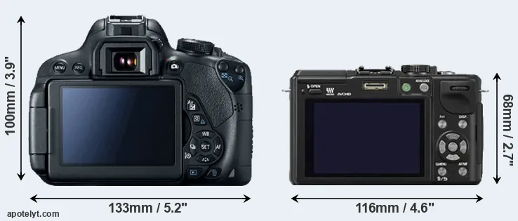 The side-by-side display below illustrates the physical size and weight of the Canon T5i and the Panasonic GX1. The two cameras are presented according to their relative size. Three consecutive views from the front, the top, and the rear side are shown. All width, height and depth dimensions are rounded to the nearest millimeter.