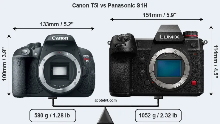 If the front view area (width x height) of the cameras is taken as an aggregate measure of their size, the Panasonic S1H is notably larger (29 percent) than the Canon T5i. Moreover, the S1H is substantially heavier (81 percent) than the T5i. It is noteworthy in this context that the S1H is splash and dust-proof, while the T5i does not feature any corresponding weather-sealing.