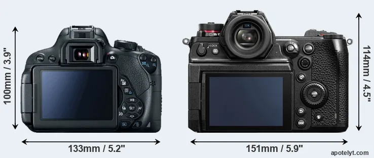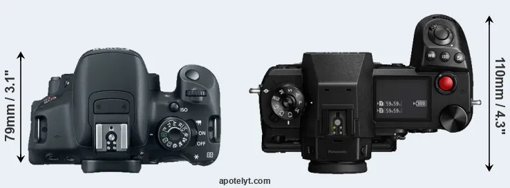 The physical size and weight of the Canon T5i and the Panasonic S1H are illustrated in the side-by-side display below. The two cameras are presented according to their relative size. Three successive views from the front, the top, and the rear are shown. All width, height and depth measures are rounded to the nearest millimeter.