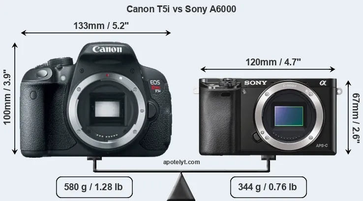 If the front view area (width x height) of the cameras is taken as an aggregate measure of their size, the Sony A6000 is considerably smaller (40 percent) than the Canon T5i. Moreover, the A6000 is substantially lighter (41 percent) than the T5i. In this context, it is worth noting that neither the T5i nor the A6000 are weather-sealed.