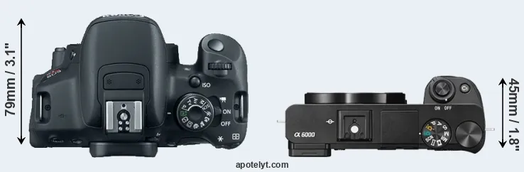 An illustration of the physical size and weight of the Canon T5i and the Sony A6000 is provided in the side-by-side display below. The two cameras are presented according to their relative size. Three consecutive perspectives from the front, the top, and the back are available. All size dimensions are rounded to the nearest millimeter.