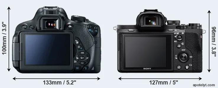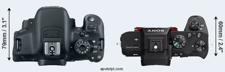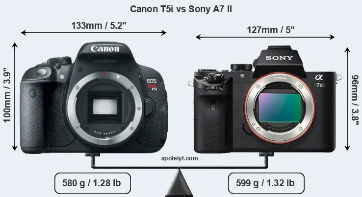 The side-by-side display below illustrates the physical size and weight of the Canon T5i and the Sony A7 II. The two cameras are presented according to their relative size. Three successive views from the front, the top, and the rear are shown. All width, height and depth dimensions are rounded to the nearest millimeter.