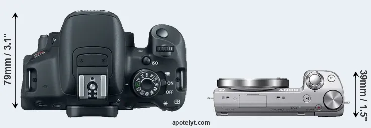 An illustration of the physical size and weight of the Canon T5i and the Sony NEX-5T is provided in the side-by-side display below. The two cameras are presented according to their relative size. Three consecutive perspectives from the front, the top, and the back are available. All size dimensions are rounded to the nearest millimeter.