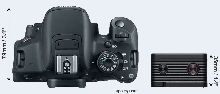 The side-by-side display below illustrates the physical size and weight of the Canon T5i and the Sony RX0 II. The two cameras are presented according to their relative size. Three successive views from the front, the top, and the rear are shown. All size dimensions are rounded to the nearest millimeter.