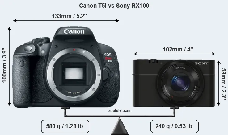 If the front view area (width x height) of the cameras is taken as an aggregate measure of their size, the Sony RX100 is considerably smaller (56 percent) than the Canon T5i. In this context, it is worth noting that neither the T5i nor the RX100 are weather-sealed.