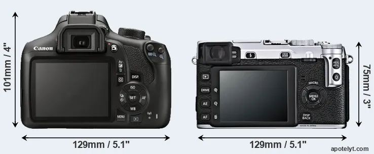 The side-by-side display below illustrates the physical size and weight of the Canon T6 and the Fujifilm X-E1. The two cameras are presented according to their relative size. Three successive views from the front, the top, and the rear are shown. All width, height and depth dimensions are rounded to the nearest millimeter.