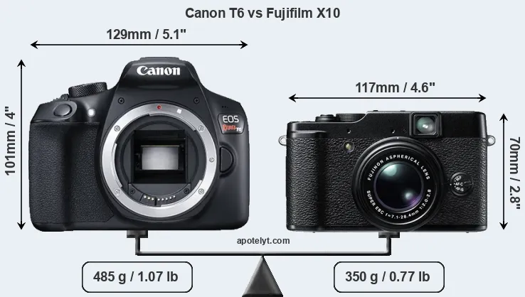 The side-by-side display below illustrates the physical size and weight of the Canon T6 and the Fujifilm X10. The two cameras are presented according to their relative size. Three successive views from the front, the top, and the rear are shown. All size dimensions are rounded to the nearest millimeter.