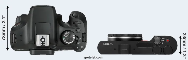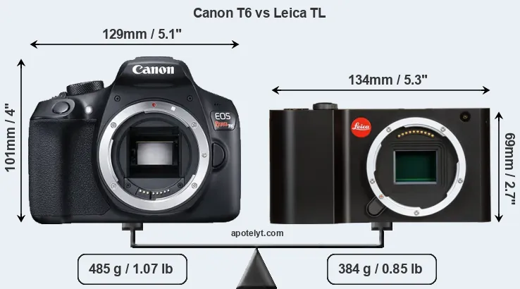 The side-by-side display below illustrates the physical size and weight of the Canon T6 and the Leica TL. The two cameras are presented according to their relative size. Three consecutive perspectives from the front, the top, and the back are available. All width, height and depth dimensions are rounded to the nearest millimeter.
