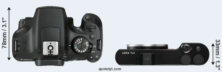 The side-by-side display below illustrates the physical size and weight of the Canon T6 and the Leica TL2. The two cameras are presented according to their relative size. Three successive views from the front, the top, and the rear are shown. All width, height and depth measures are rounded to the nearest millimeter.