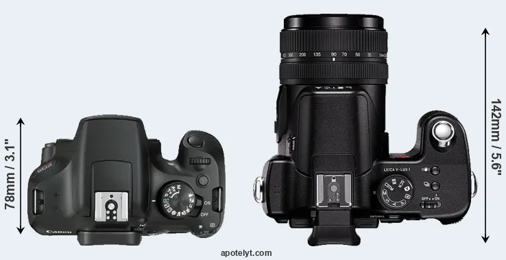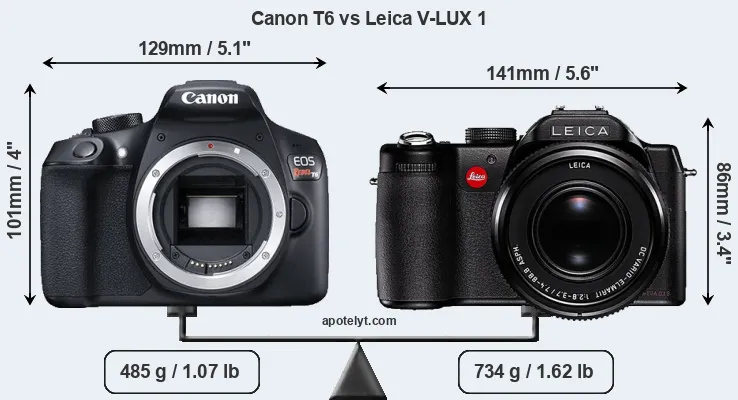 The physical size and weight of the Canon T6 and the Leica V-LUX 1 are illustrated in the side-by-side display below. The two cameras are presented according to their relative size. Three consecutive perspectives from the front, the top, and the back are available. All width, height and depth dimensions are rounded to the nearest millimeter.