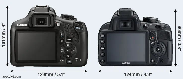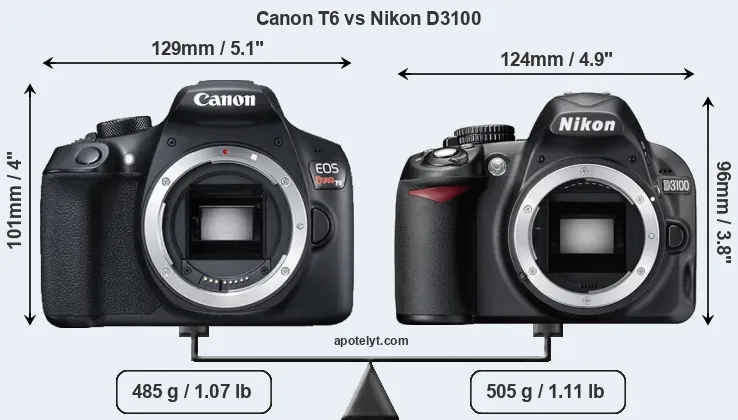 The side-by-side display below illustrates the physical size and weight of the Canon T6 and the Nikon D3100. The two cameras are presented according to their relative size. Three consecutive views from the front, the top, and the rear side are shown. All width, height and depth dimensions are rounded to the nearest millimeter.