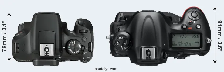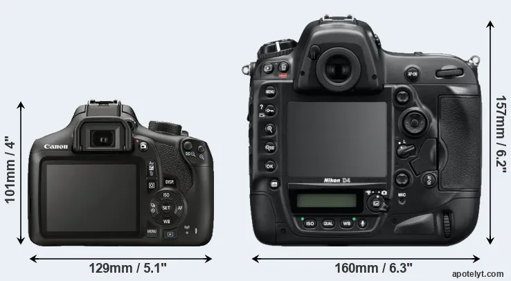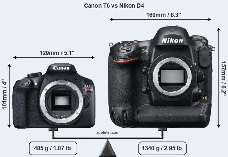An illustration of the physical size and weight of the Canon T6 and the Nikon D4 is provided in the side-by-side display below. The two cameras are presented according to their relative size. Three successive views from the front, the top, and the rear are shown. All width, height and depth dimensions are rounded to the nearest millimeter.