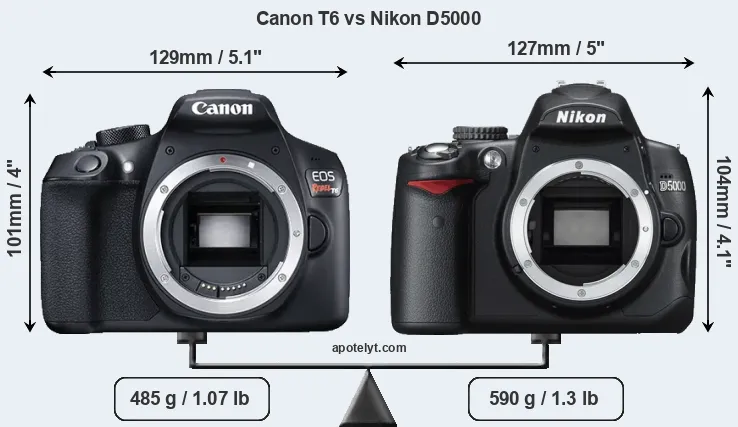 An illustration of the physical size and weight of the Canon T6 and the Nikon D5000 is provided in the side-by-side display below. The two cameras are presented according to their relative size. Three consecutive perspectives from the front, the top, and the back are available. All size dimensions are rounded to the nearest millimeter.