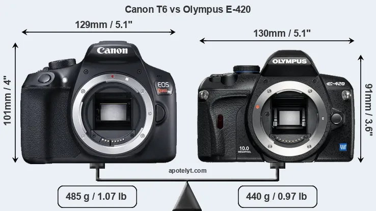 An illustration of the physical size and weight of the Canon T6 and the Olympus E-420 is provided in the side-by-side display below. The two cameras are presented according to their relative size. Three successive views from the front, the top, and the rear are shown. All width, height and depth dimensions are rounded to the nearest millimeter.